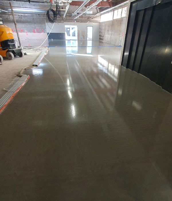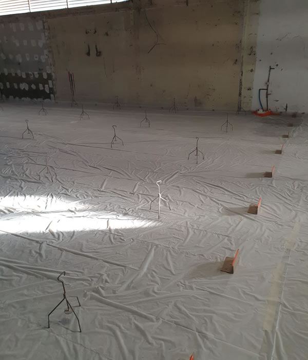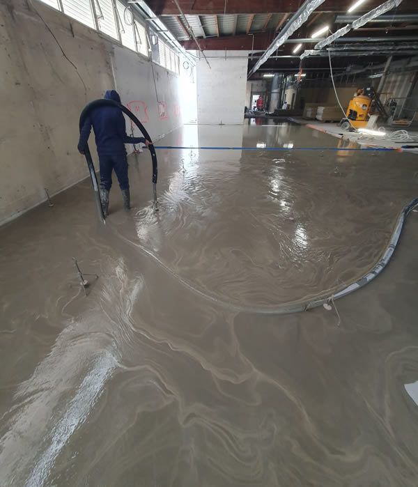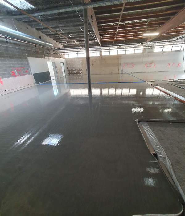 Application de 21m3 de chape fluide ciment pour une future salle de sport.